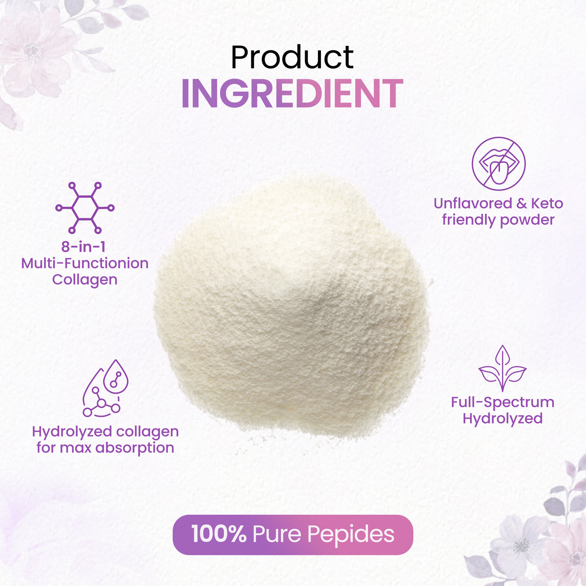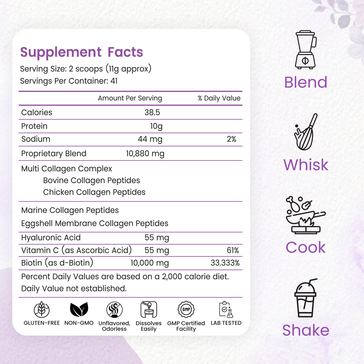 Experience the power of 11g of premium hydrolyzed collagen peptides per serving, designed for optimal absorption to nourish your skin, hair, nails, and joints. This multi-collagen complex includes Types I, II, III, V, and X from bovine, chicken, marine, and eggshell sources, ensuring a comprehensive beauty and wellness boost. Infused with hyaluronic acid for deep hydration, vitamin C for collagen synthesis, and biotin for enhanced beauty support, this formula promotes youthful skin, strong nails, healthy joints, and gut health. Non-GMO, free from soy, dairy, gluten, and tree nuts, and third-party lab tested for purity, this unflavored powder easily mixes into any drink, making it the perfect daily supplement for both men and women.